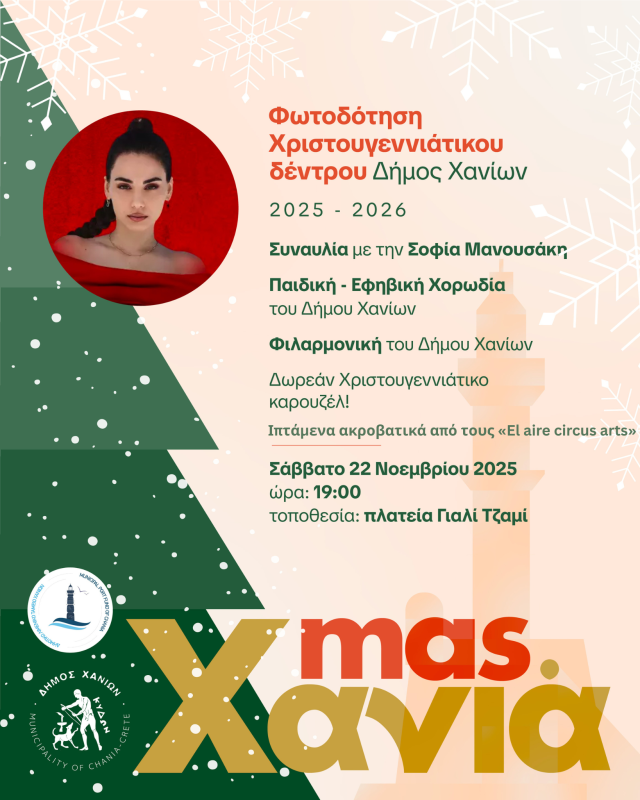 Ο Αντιδήμαρχος Πολιτισμού, Γιάννης Γιαννακάκης, από την πλευρά του, υπογράμμισε: «Το Σάββατο 22 Νοεμβρίου σας περιμένουμε όλους στο Ενετικό Λιμάνι, εκεί, στην πλατεία πίσω από το Γυαλί Τζαμί, όπου θα ανάψουμε το δέντρο. Θα ξεκινήσουμε τους εορτασμούς της φετινής χρονιάς για τα Χριστούγεννα και την Πρωτοχρονιά, 2025-2026. Η εκδήλωση θα ξεκινήσει στις 19:00, θα συμμετέχουν η Φιλαρμονική του Δήμου Χανίων και η Παιδική-Εφηβική Χορωδία του Δήμου Χανίων, ενώ το πρόγραμμα θα κορυφωθεί με την παρουσία της Σοφίας Μανουσάκη, σε έναν διαφορετικό ρόλο, πολύ πιο ροκ, πολύ πιο ποπ, έναν ρόλο που της έχει δώσει την ευκαιρία να γεμίζει αίθουσες συναυλιών σε όλη την Ελλάδα. Παράλληλα, θα υπάρχει το photoboothaki, που όποιος επιθυμεί θα μπορεί να βγάλει φωτογραφίες δωρεάν, καθώς και χοροί aerial.Το σημαντικό είναι ότι ο καιρός αναμένεται να είναι καλός και η διάθεσή μας να είναι στο κατακόρυφο, έτσι ώστε να έχουμε την ευκαιρία όλοι να δώσουμε ένα γερό ποδαρικό και σε αυτή τη γιορτινή περίοδο».