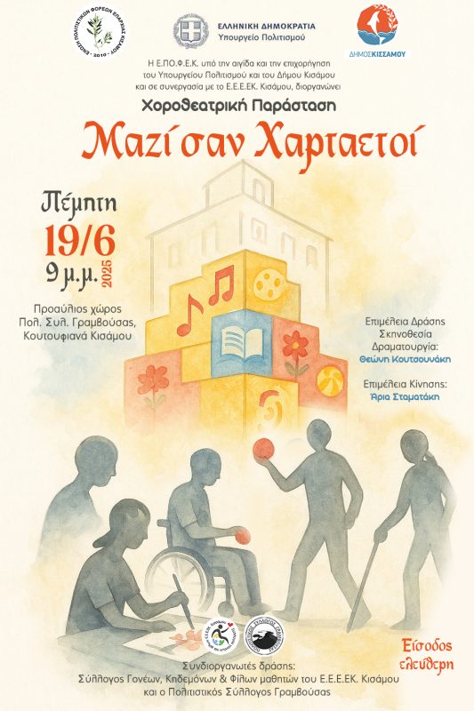 Η Ένωση Πολιτιστικών Φορέων Επαρχίας Κισάμου (Ε.ΠΟ.Φ.Ε.Κ.), υπό την αιγίδα και την επιχορήγηση του Υπουργείου Πολιτισμού και του Δήμου Κισάμου και σε συνεργασία με το Ειδικό Εργαστήριο Επαγγελματικής Εκπαίδευσης Κισάμου – Ε.Ε.Ε.ΕΚ. Κισάμου, διοργανώνει Χοροθεατρική παράσταση με γενικό τίτλο: «Μαζί σαν χαρταετοί».