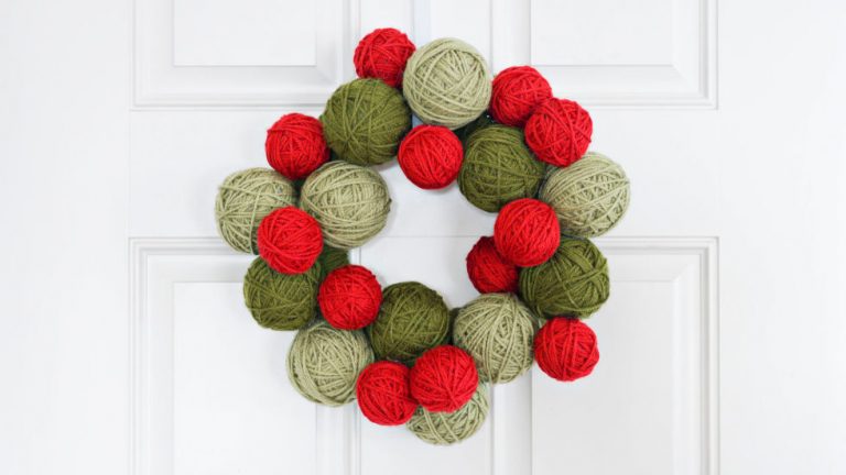 Μικρότερες και μεγαλύτερες μπάλες από μαλλί πλεξίματος μπορούν να γίνουν ένα κομψό στεφάνι για την πόρτα σου!