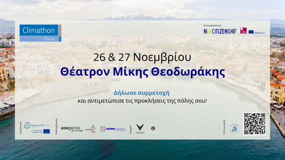 Το Climathon στα Χανιά θα διοργανωθεί στις 26 και 27 Νοεμβρίου 2022 στο Θέατρο Μίκης Θεοδωράκης από την Ecogenia, το Youthmakers Hub και το ΕΚ ΑΘΗΝΑ, που διευθύνει το EIT Climate-KIC Hub Greece και σε συνεργασία με τη Δραστηριότητα Συμμετοχής Νέων στο πλαίσιο του Key Action 1 του προγράμματος Erasmus+ nEU Citizenship, που χρηματοδοτείται από τον Εθνικό Φορέα της Ελλάδος (Grant Agreement 2021-2-EL02-KA154-YOU-