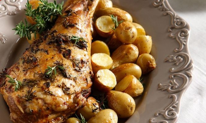 1 μπούτι και 1 χεράκι (ή 2 μπούτια) από αρνάκι ή κατσικάκι γάλακτος, συνολικού βάρους περίπου 2½ – 3 κιλών, με το κόκαλο