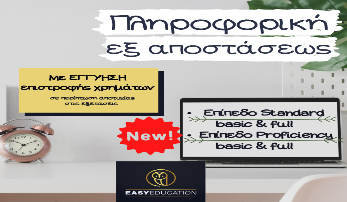Τα κέντρα Δια Βίου Μάθησης Easy Education, εδώ και 13 χρόνια, υλοποιούν προγράμματα Πληροφορικής τα οποία οδηγούν στην απόκτηση πιστοποιητικού αναγνωρισμένου από ελληνικό Δημόσιο , ΑΣΕΠ και Ιδιωτικό τομέα. Πλέον μπορείτε να παρακολουθήσετε πρόγραμμα πληροφορικής επιπέδου Proficiency και να διαφοροποιηθείτε στην αγορά εργασίας. Εγγύηση επιστροφής χρημάτων σε περίπτωση αποτυχίας.*