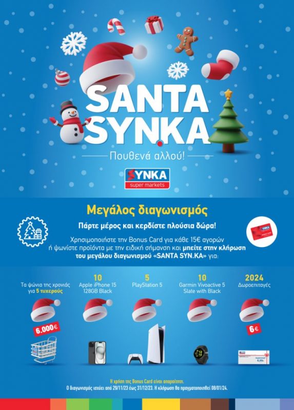 Διαγωνισμό… SANTA SYNKA δεν θα βρείτε πουθενά αλλού! Κάντε και αυτές τις γιορτές τις αγορές σας με την Bonus Card και μπείτε στην κλήρωση για να κερδίσετε τα ψώνια ολόκληρου του 2024, PlayStation 5, iPhones, smartwatches και χιλιάδες ακόμη δώρα! Μάθετε πώς στο bit.ly/santa-synka