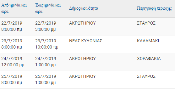 Προγραμματισμένες διακοπές ρεύματος ανακοίνωσε η ΔΕΔΔΗΕ οι οποίες θα ξεκινήσουν από τη Δευτέρα 22 Ιουλίου και θα ολοκληρωθούν μέχρι την Παρασκευή 26 Ιουλίου, προκειμένου να γίνουν εργασίες αποκατάστασης του δικτύου.