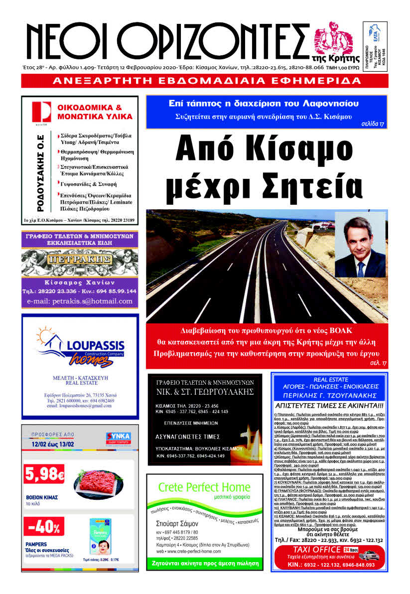 *Από Κίσαμο μέχρι Σητεία. Διαβεβαίωση του πρωθυπουργού ότι ο νέος ΒΟΑΚ θα κατασκευαστεί από την μια άκρη της Κρήτης μέχρι την άλλη. Προβληματισμός για την καθυστέρηση στην προκήρυξη του έργου.