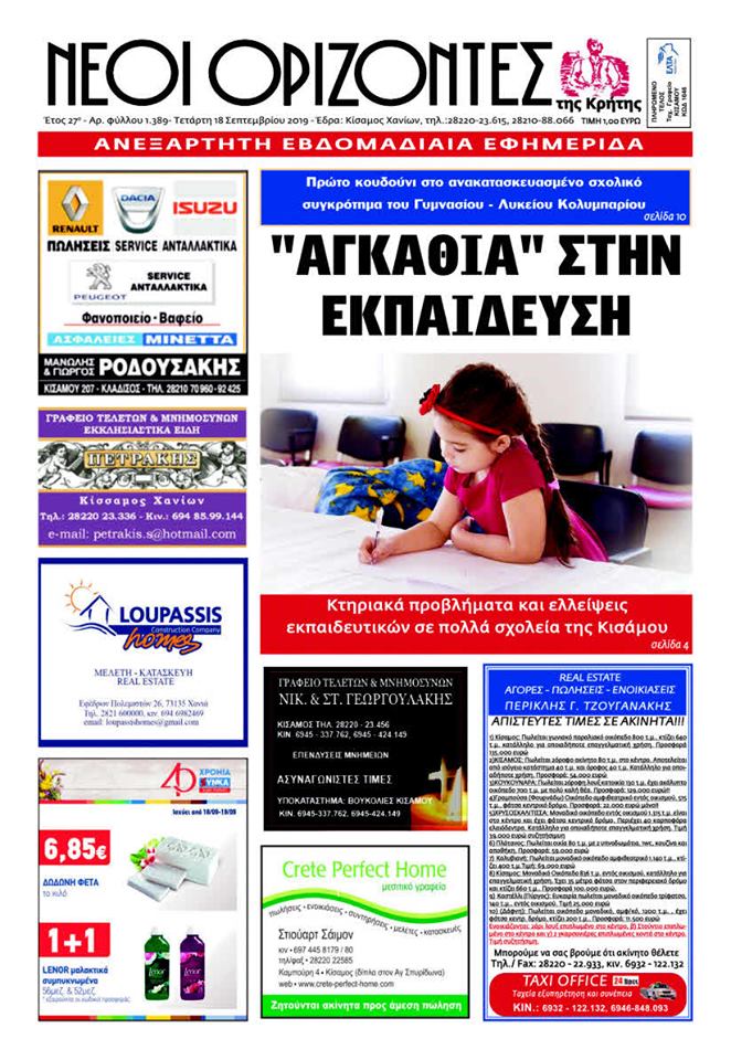 Και πολλά ακόμη σχόλια και θέματα από την Κίσαμο και όχι μόνο στην εφημερίδα Νέοι Ορίζοντες που κυκλοφορεί την Τετάρτη 18 Σεπτεμβρίου.