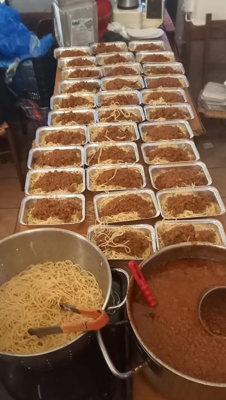 Η επίσκεψη αυτή με άφησε κατάπληκτη εν τη αδυναμία μου να αντιμετωπίσω τόσο όγκο φαγητού. Είδα να ζυμώνονται 120 κιλά κιμάς για γιουβαρλάκια, να τεμαχίζονται καμιά διακοσαριά ψωμιά, είδα να γεμίζει ένας κουβάς με μαϊντανό ή δυόσμο. Στην προσπάθειά του, μεγάλη είναι η εθελοντική προσφορά της γειτονιάς, γιατί είναι καλό κοπέλι και τον αγαπούνε.