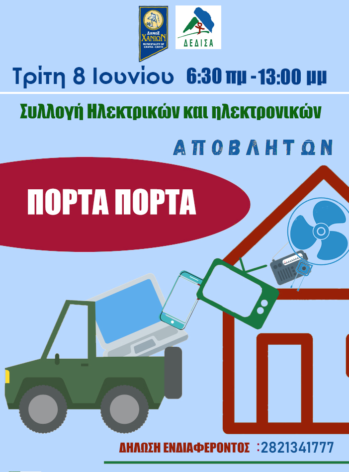 Ο Δήμος Χανίων σε συνεργασία με τη Διαδημοτική Επιχείρηση Διαχείρισης Στερεών Αποβλήτων (Δ.Ε.ΔΙ.Σ.Α. ΑΕ), μετά από επιθυμία του κοινού, πραγματοποιεί συλλογή ηλεκτρικών και ηλεκτρονικών αποβλήτων με το σύστημα «πόρτα-πόρτα».