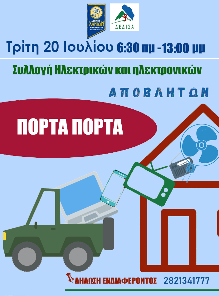 Ο Δήμος Χανίων σε συνεργασία με τη Διαδημοτική Επιχείρηση Διαχείρισης Στερεών Αποβλήτων (Δ.Ε.ΔΙ.Σ.Α. ΑΕ), μετά από αυξημένη επιθυμία του κοινού, πραγματοποιεί για ακόμα μία φορά, συλλογή ηλεκτρικών και ηλεκτρονικών αποβλήτων με το σύστημα «πόρτα-πόρτα».