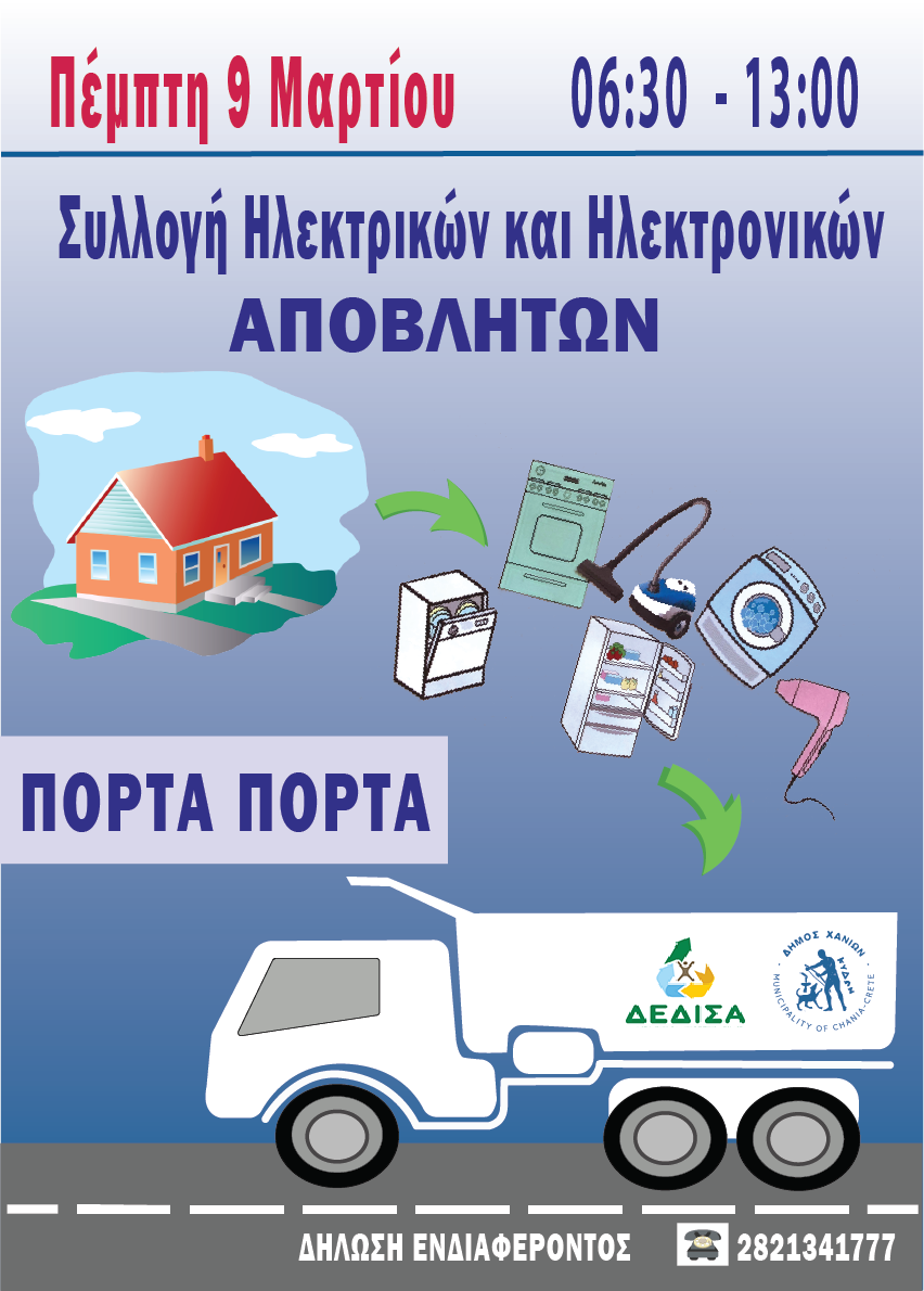 Ο Δήμος Χανίων σε συνεργασία με τη Διαδημοτική Επιχείρηση Διαχείρισης Στερεών Αποβλήτων [Δ.Ε.ΔΙ.Σ.Α. ΑΕ (ΟΤΑ)] πραγματοποιεί για ακόμα μία φορά τη συλλογή ηλεκτρικών και ηλεκτρονικών αποβλήτων με το σύστημα «πόρτα-πόρτα».