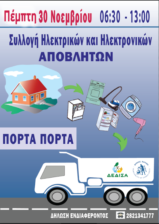 Ο Δήμος Χανίων σε συνεργασία με τη Διαδημοτική Επιχείρηση Διαχείρισης Στερεών Αποβλήτων [Δ.Ε.ΔΙ.Σ.Α. ΑΕ (ΟΤΑ)] πραγματοποιεί για ακόμα μία φορά τη συλλογή ηλεκτρικών και ηλεκτρονικών αποβλήτων με το σύστημα «πόρτα-πόρτα», στο πλαίσιο των διαρκών δράσεων για ανακύκλωση των συσκευών.