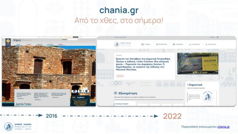 Η επίσημη παρουσίαση της ανανεωμένης ιστοσελίδας του Δήμου Χανίων www.chania.gr πραγματοποιήθηκε την Πέμπτη, 14/4/2022, μέσω ζωντανής διαδικτυακής εκδήλωσης (live-streaming) στα επίσημα κανάλια του Δήμου στα social media.