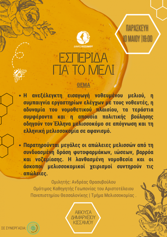 Ομιλητής: Ανδρέας Θρασυβούλου, Ομότιμος Καθηγητής Γεωπονίας του Αριστοτέλειου Πανεπιστημίου Θεσσαλονίκης τμήμα Μελισσοκομίας .