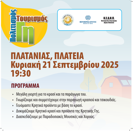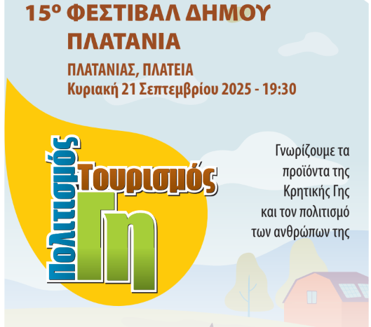 Ο Δήμος Πλατανιά και η Κοινωφελής Επιχείρηση Δήμου Πλατανιά (Κ.Ε.Δ.Η.Π.), σε συνεργασία με την Περιφέρεια Κρήτης και με την υποστήριξη των τοπικών φορέων, διοργανώνουν το 15ο Φεστιβάλ «Γη – Πολιτισμός – Τουρισμός», την Κυριακή 21 Σεπτεμβρίου 2025, στις 19:30, στην πλατεία του Πλατανιά.
