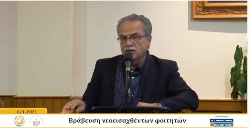 “….Ο Δήμος μας θέλοντας να διατηρήσει την παράδοση, η εκδήλωση αυτή να γίνεται ανήμερα των Θεοφανίων, αλλά και να επιβραβεύσει τους πρωτοετείς φοιτητές που πέτυχαν το στόχο τους, παρά τις αντίξοες συνθήκες, αποφάσισε να πραγματοποιήσει την εκδήλωση διαδικτυακά, τηρώντας πάντα τα απαραίτητα μέτρα προστασίας ενάντια στην εξάπλωση του Covid 19.