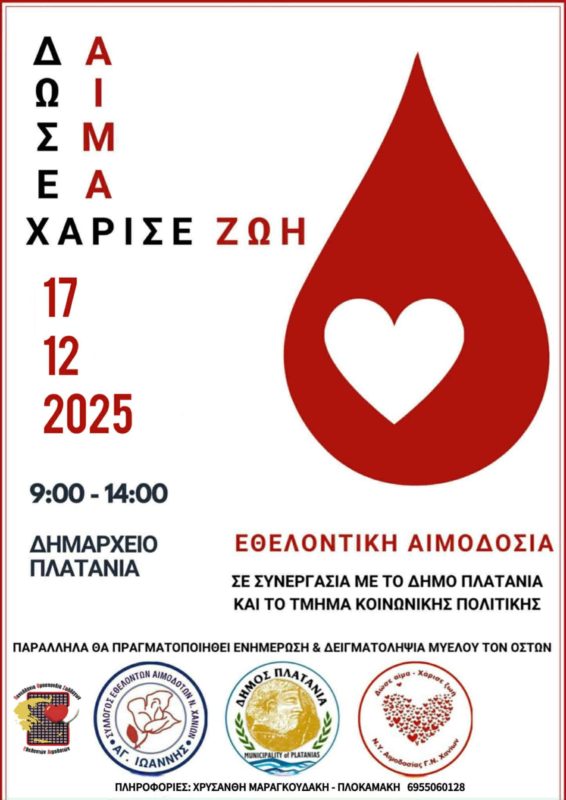 Η εθελοντική αιμοδοσία θα πραγματοποιηθεί την Τετάρτη 17 Δεκεμβρίου 2025, από τις 09:00 π.μ. έως τις 14:00 μ.μ., στο Δημαρχείο Πλατανιά (Γεράνι).