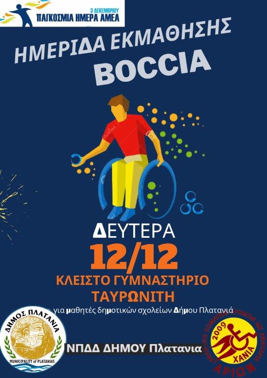 Στο πλαίσιο εορτασμού της 3ης Δεκεμβρίου ως Παγκόσμιας Ημέρας Ατόμων με Αναπηρία, το Νομικό Πρόσωπο Δημοσίου Δικαίου Δήμου Πλατανιά και ο Δήμος Πλατανιά , σε συνεργασία με το Αθλητικό Σωματείο “ΑΡΙΩΝ” (με έδρα τα Χανιά), διοργανώνουν ημερίδα εκμάθησης BOCCIA, για μαθητές δημοτικών σχολείων της περιφέρειας του δήμου μας, τη Δευτέρα 12-12-2022 από τις 9:30π.μ. έως και 12:30μ.μ.,στο χώρο του κλειστού γυμναστηρίου Ταυρωνίτη.