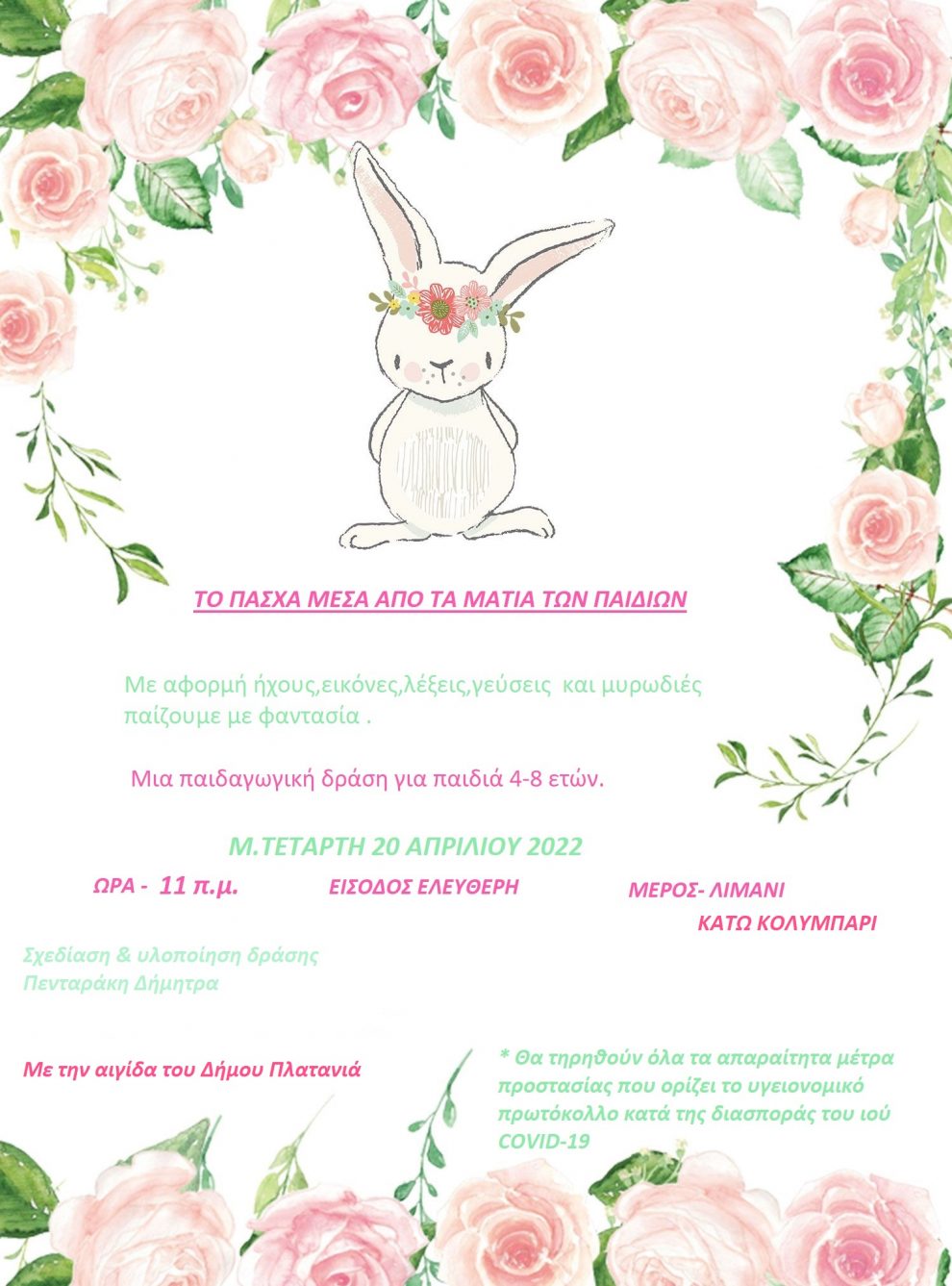 Η συγγραφέας και εμψυχώτρια θεατρικού παιχνιδιού, Πενταράκη Δήμητρα υπό την αιγίδα του Δήμου Πλατανιά, θα παρουσιάσει την Μεγάλη Τετάρτη 20 Απριλίου και ώρα 11:00 π.μ., στο Κάτω Κολυμβάρι -Λιμάνι, την παιδαγωγική δράση που απευθύνεται σε παιδιά 5-8 ετών, γεμάτη από ήχους , εικόνες , γεύσεις και αρώματα πασχαλινά.