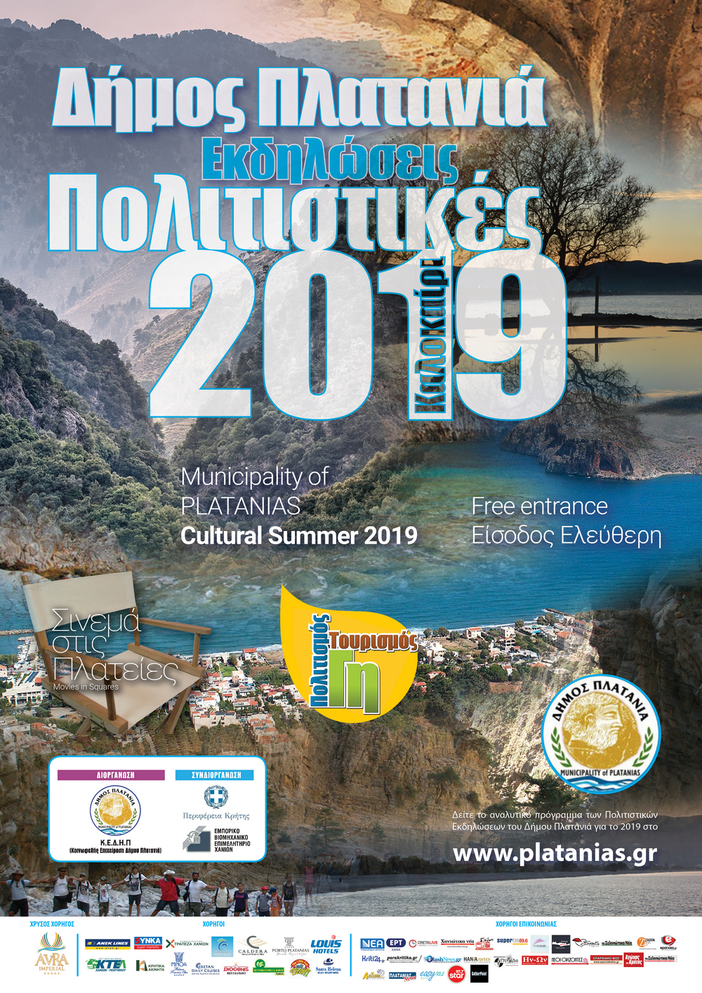 Επίσης, συνεχίζονται οι πολιτιστικές εκδηλώσεις που διοργανώνει ο Δήμος Πλατανιά , στα πλαίσια των δράσεων του για το Πολιτιστικό Καλοκαίρι 2019, πιο συγκεκριμένα, τις επόμενες ημέρες ακολουθούν οι παρακάτω εκδηλώσεις: