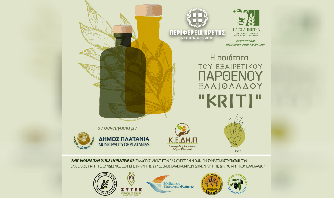 Η Περιφέρεια Κρήτης και ο Ελληνικός Γεωργικός Οργανισμός-ΔΗΜΗΤΡΑ (ΕΛΓΟ-ΔΗΜΗΤΡΑ), σε συνεργασία με το Δήμο Πλατανιά και την Κοινωφελή Επιχείρηση Δήμου Πλατανιά (ΚΕ.ΔΗ.Π.), διοργανώνουν εσπερίδα για την ποιότητα του Εξαιρετικού Παρθένου Ελαιόλαδου “Κρήτη/Kriti”, η οποία θα πραγματοποιηθεί την Τετάρτη 27 Νοεμβρίου 2024 στις 17:00 μ.μ στην Αίθουσα του Πολιτιστικού Κέντρου Μάλεμε.