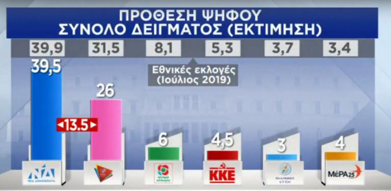 Στην πρώτη μέτρηση της εταιρείας μετά τις εκλογές της 7ης Ιουλίου και την εμφάνιση των πολιτικών αρχηγών στη ΔΕΘ, η ΝΔ συγκεντρώνει ποσοστό 39,5% στην πρόθεση ψήφου με τον ΣΥΡΙΖΑ να βρίσκεται στο 26%.