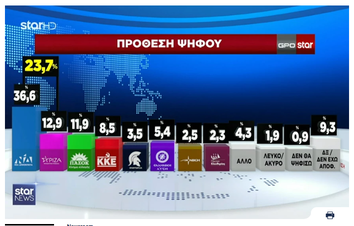 Στην πρόθεση ψήφου, η ΝΔ λαμβάνει 36,6% , ο ΣΥΡΙΖΑ 12,9%, το ΠΑΣΟΚ 11,9%, το ΚΚΕ 8,4%, η Πλεύση Ελευθερίας 2,3%, η Νίκη 2,5%, οι Σπαρτιάτες 3,5% και 5,4% η Ελληνική Λύση.