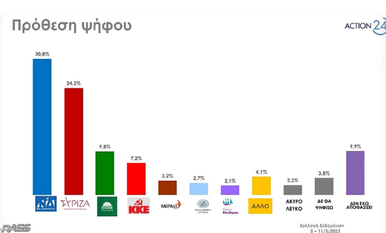 Προβάδισμα 6,6 ποσοστιαίων μονάδων της Νέας Δημοκρατίας έναντι του ΣΥΡΙΖΑ εμφανίζει η δημοσκόπηση της RASS, που διενεργήθηκε για λογαριασμό του ACTION 24.