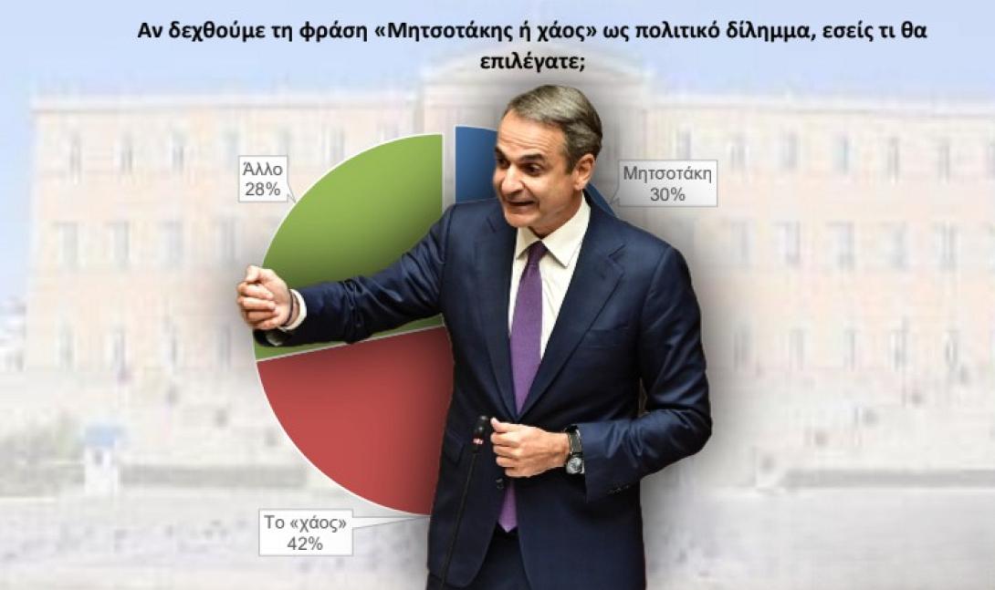 Στο πολιτικό δίλημμα «Μητσοτάκης ή χάος», το 42% των ερωτηθέντων απαντά «το χάος», έναντι 30% που επιλέγουν τον Κυριάκο Μητσοτάκη, ενώ ένα 28% δηλώνει «Άλλο». Οι συχνότερες αναφορές στην κατηγορία «Άλλο» αφορούν προτάσεις όπως συνασπισμός κομμάτων, οικουμενική κυβέρνηση, κυβέρνηση συνεργασίας ή αλλαγή πολιτικών αρχηγών.