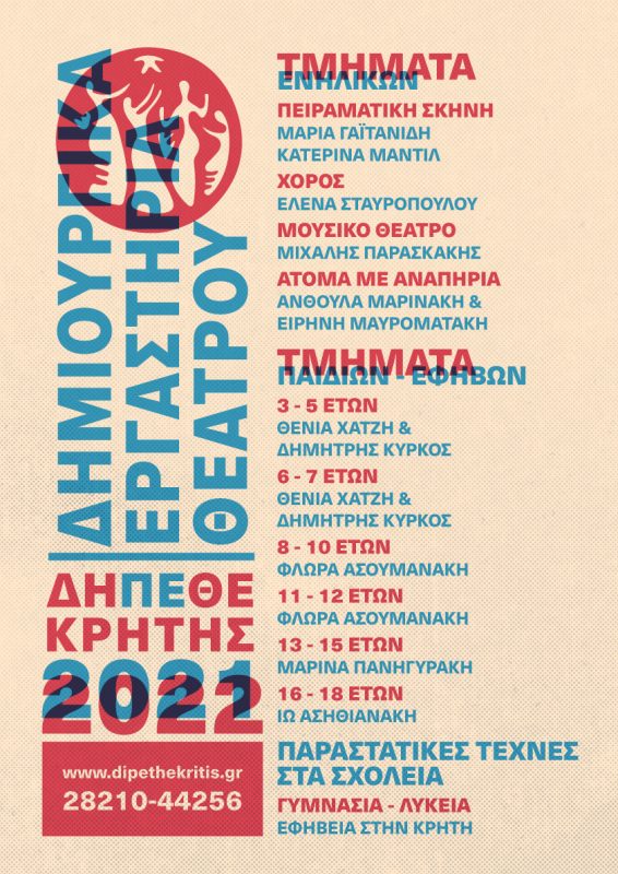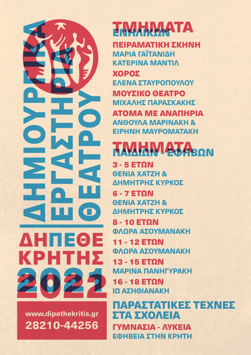 Το Δημοτικό Περιφερειακό Θέατρο Κρήτης στο πλαίσιο των εκπαιδευτικών δραστηριοτήτων του, ανακοινώνει την έναρξη των εργαστηρίων  του για το 2021-2022, προτείνοντας ποικίλες θεματικές, για νέες ομάδες κοινού και στοχεύοντας στη συμμετοχή παλιών και νέων φίλων.