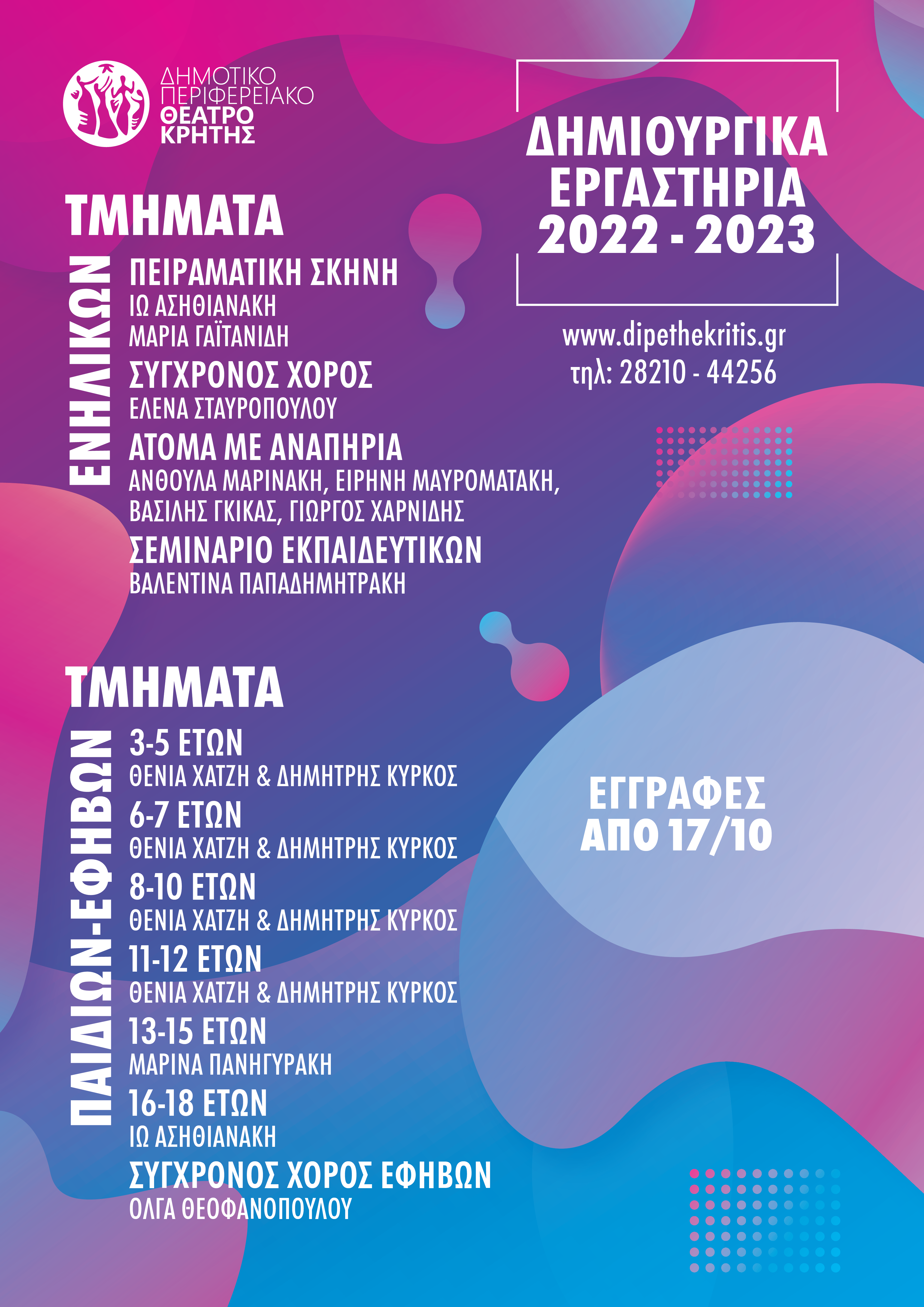 Το Δημοτικό Περιφερειακό Θέατρο Κρήτης στο πλαίσιο των εκπαιδευτικών δραστηριοτήτων του, ανακοινώνει την έναρξη των εργαστηρίων του για το 2022-2023, προτείνοντας ποικίλες θεματικές, στοχεύοντας στη συμμετοχή παλιών και νέων φίλων.