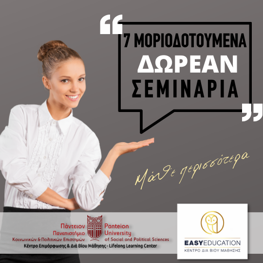 Τα παραπάνω δωρεάν εξ αποστάσεως μοριοδοτούμενα σεμινάρια υλοποιούνται απο το ΚΕΔΙΒΙΜ του Παντείου Πανεπιστημίου σε συνεργασία με το ΚΕΔΙΒΙΜ Easy Education .