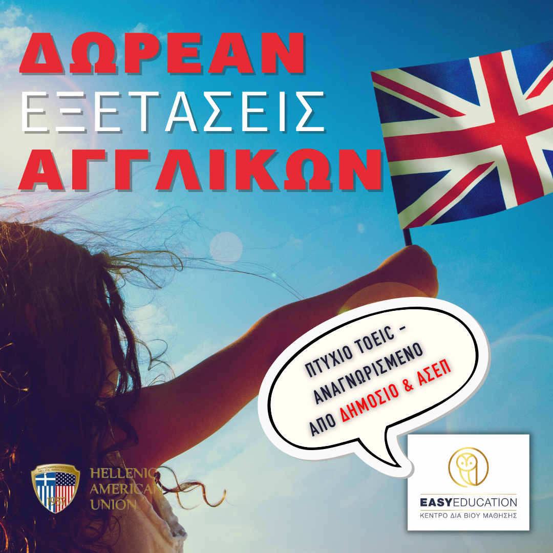 Τα Κέντρα Δια Βίου Μάθησης, Easy Education, στα πλαίσια της εταιρικής κοινωνικής ευθύνης, σε συνεργασία με την Ελληνοαμερικανική Ένωση, όντας άρρηκτα συνδεδεμένο με το σύνολο των εκπαιδευομένων πανελλαδικά και επιθυμώντας την περαιτέρω υποστήριξή τους, παρέχουν το δικαίωμα για δωρεάν εξ αποστάσεως προετοιμασία και για δωρεάν άμεση συμμετοχή σε εξετάσεις Αγγλικής Γλώσσας* με σκοπό να συμβάλλει καταλυτικά στην επιμόρφωση και πιστοποίηση όσο το δυνατόν περισσότερων ενδιαφερόμενων.