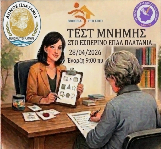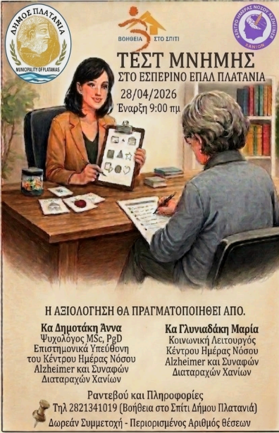 Το Πρόγραμμα «Βοήθεια στο Σπίτι» του Δήμου Πλατανιά, σε συνεργασία με το Κέντρο Ημέρας Νόσου Alzheimer και Συναφών Διαταραχών Χανίων, διοργανώνουν δράση προληπτικού ελέγχου μνήμης την Τρίτη 28 Απριλίου 2026, στο Εσπερινό ΕΠΑ.Λ. Πλατανιά στον Ταυρωνίτη, από τις 09:00 έως τις 14:00.