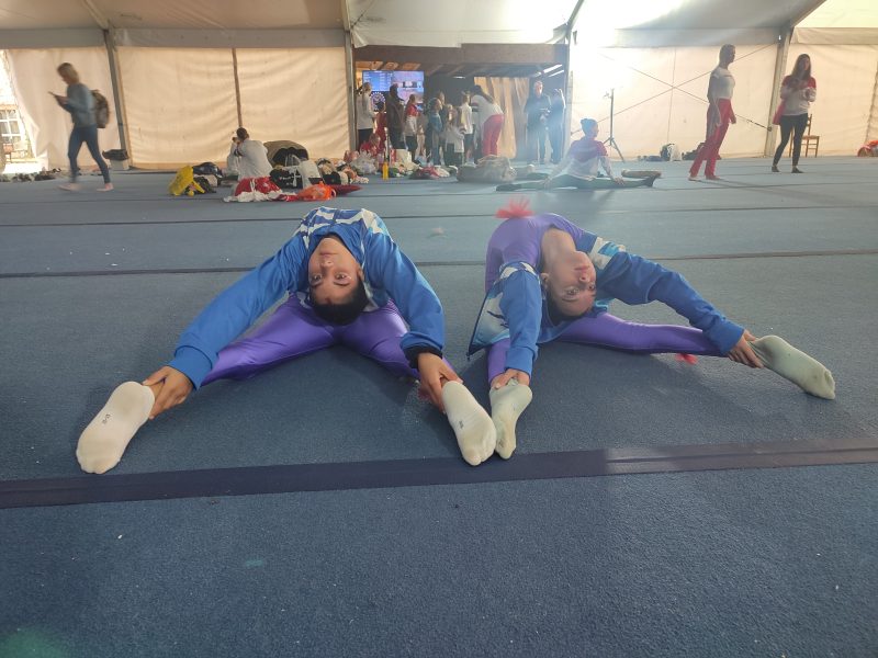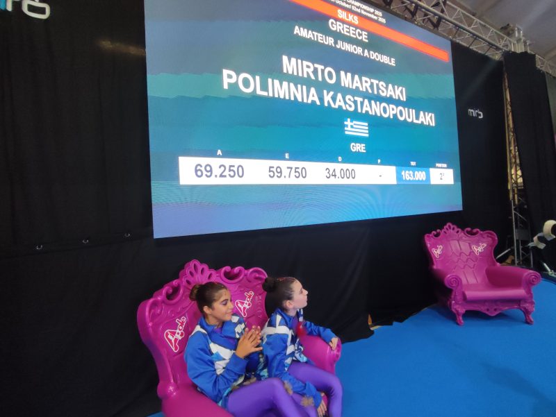 Ιδιαίτερη αίσθηση προκάλεσε και η εμφάνιση των Πωλίνας Καστανοπουλάκη και Μυρτώς Μαρτσάκη, οι οποίες αγωνίστηκαν σε ντουέτο στο αέριο όργανο, παρουσιάζοντας ένα άρτια δομημένο πρόγραμμα με έντονη θεατρικότητα, υψηλό βαθμό δυσκολίας και εξαιρετικό συγχρονισμό. Η αρμονία στις κινήσεις τους και η δυναμική των ακροβατικών συνδυασμών ανέδειξαν το επίπεδο της ομαδικής δουλειάς και της συστηματικής προετοιμασίας τους.