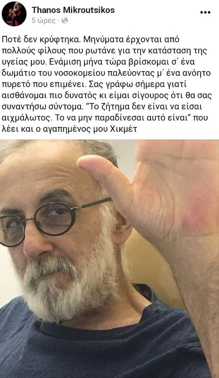 Ποτέ δεν κρύφτηκα. Μηνύματα έρχονται από πολλούς φίλους που ρωτάνε για την κατάσταση της υγείας μου. Ενάμιση μήνα τώρα βρίσκομαι σ΄ ένα δωμάτιο του νοσοκομείου παλεύοντας μ΄ ένα ανόητο πυρετό που επιμένει. Σας γράφω σήμερα γιατί αισθάνομαι πιο δυνατός κι είμαι σίγουρος ότι θα σας συναντήσω σύντομα. “Το ζήτημα δεν είναι να είσαι αιχμάλωτος. Το να μην παραδίνεσαι αυτό είναι” που λέει και ο αγαπημένος μου Χικμέτ”.