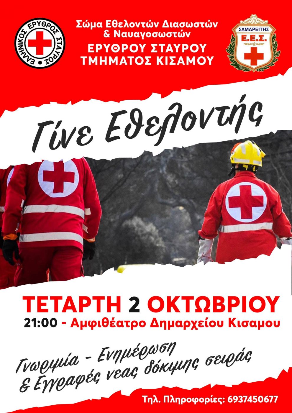 Σας περιμένουμε την επόμενη Τετάρτη 2 Οκτωβρίου, στις 9 το βράδυ, στην αίθουσα εκδηλώσεων του Δήμου Κισάμου, να γνωριστούμε, να σας ενημερώσουμε για τις δράσεις μας, και φυσικά για να σας εξηγήσουμε, γιατί σας θέλουμε μαζί μας , στην μεγάλη οικογένεια του Ελληνικού Ερυθρού Σταυρού!