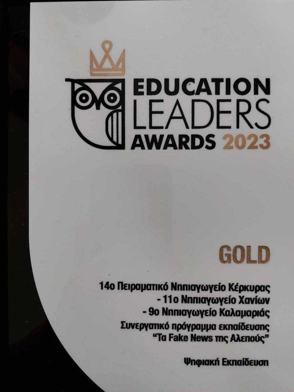Με το Χρυσό Βραβείο στην κατηγορία Ψηφιακή Εκπαίδευση τιμήθηκε το 11ο Νηπιαγωγείο Χανίων μαζί με το 14ο Πειραματικό Νηπιαγωγείο Κέρκυρας και το 9ο Νηπιαγωγείο Καλαμαριάς, την Δευτέρα 03 Ιουλίου 2023, στην Τελετή Απονομής των Education Leaders Awards 2023, που πραγματοποιήθηκε στο Συνεδριακό Κέντρο Πανεπιστημίου Δυτικής Αττικής.