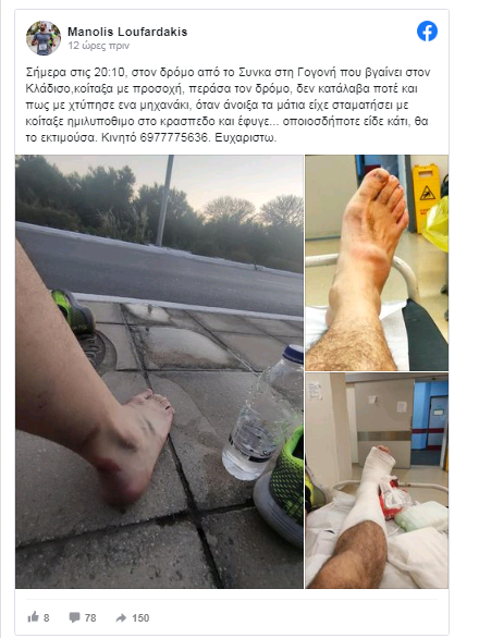 Έκκληση προκειμένου να βρεθεί ο οδηγός του δικύκλου που τον τραυμάτισε, απευθύνει ένας Χανιώτης μέσω της σελίδας του στο facebook.