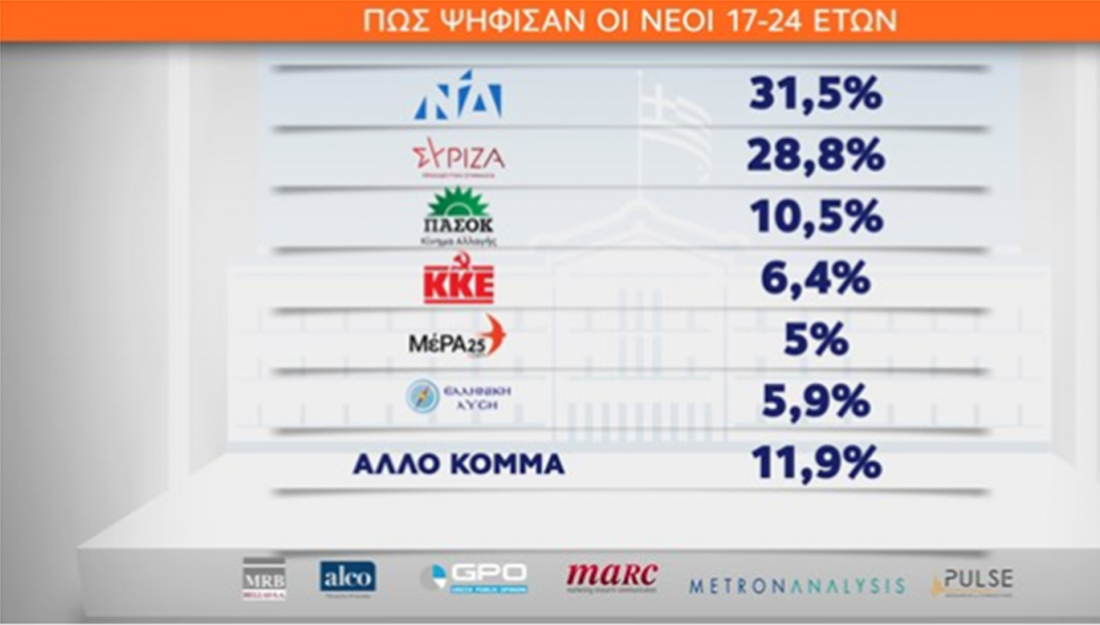 Ήττα για τον ΣΥΡΙΖΑ και στην ηλικιακή ομάδα των ψηφοφόρων 17-24 ετών σύμφωνα με το exit poll των εθνικών εκλογών.