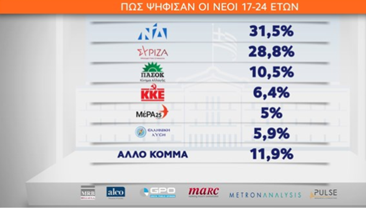 Ήττα για τον ΣΥΡΙΖΑ και στην ηλικιακή ομάδα των ψηφοφόρων 17-24 ετών σύμφωνα με το exit poll των εθνικών εκλογών.