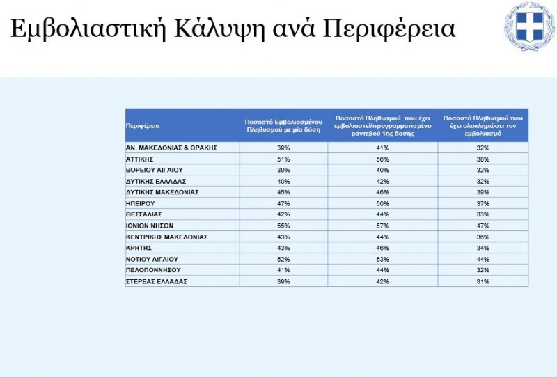 Ο πίνακας με τα ποσοστά εμβολιασμών ανά Περιφέρεια