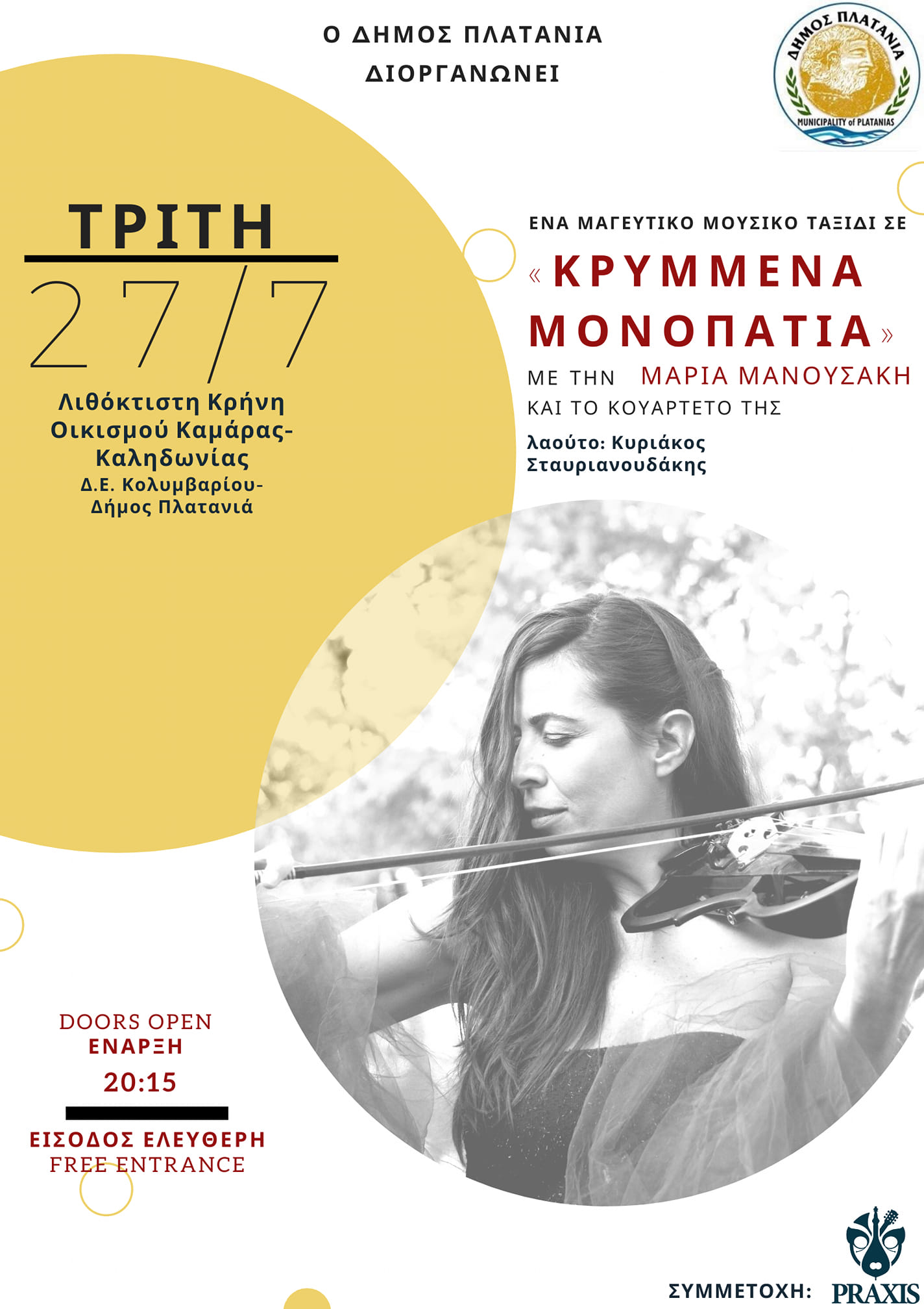Ο Δήμος Πλατανιά διοργανώνει ένα μαγευτικό μουσικό ταξίδι σε «κρυμμένα μονοπάτια», με τη βιολονίστρια Μαρία Μανουσάκη και το κουαρτέτο της, την Τρίτη 27 Ιουλίου και ώρα 20:30, στη Λιθόκτιστη Κρήνη Οικισμού Καμάρας – Καληδωνίας στη Δ.Ε Κολυμπαρίου.