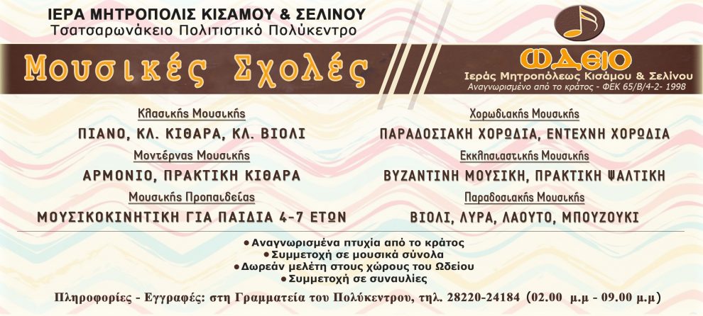 Εκ του Τσατσαρωνάκειου Πολιτιστικού Πολύκεντρου της Ι. Μητροπόλεως Κισάμου και Σελίνου ανακοινώνεται ότι άρχισαν, για το νέο Σχολικό έτος, οι εγγραφές στο Ωδείο της Μητροπόλεως, το οποίο στεγάζεται στους πλήρως εξοπλισμένους και άρτια οργανωμένους και φροντισμένους χώρους του Τσατσαρωνάκειου Πολύκεντρου. Οι Μουσικές Σχολές που θα λειτουργήσουν είναι:Σχολή Κλασικής Μουσικής: Πιάνο, Κλασική Κιθάρα, Κλασικό Βιολί, Σχολή Μοντέρνας Μουσικής: Αρμόνιο, Πρακατική Κιθάρα, Σχολή Παραδοσιακής Μουσικής: Βιολί, Λύρα, Λαούτο, Μπουζούκι, Σχολή Εκκλησιαστικής Μουσικής: Βυζαντινή Μουσική (Θεωρία)-Πρακτική, Σχολή Μουσικής Προπαιδείας: Μουσικοκινητική για παιδιά 4-7 ετών, Χορωδιακή Μουσική: Παραδοσιακή Χορωδία, Έντεχνη, Παιδική, Εφηβική.