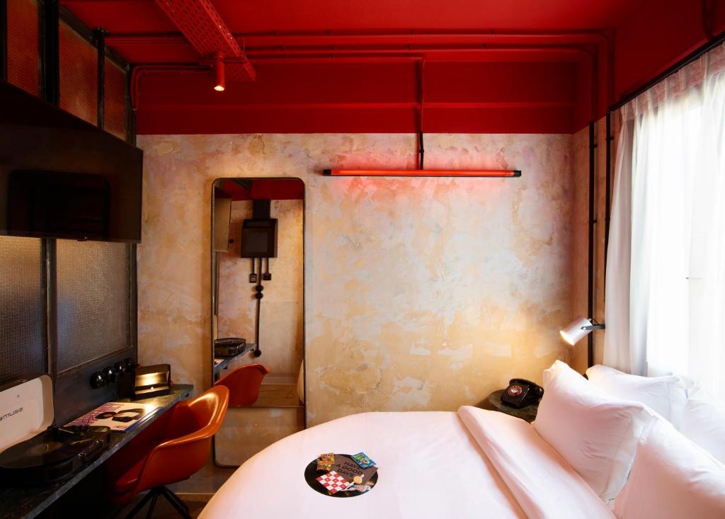 «Τα βιομηχανικού σχεδιασμού δωμάτια του ξενοδοχείου, με τα neon κόκκινα φώτα και τους γυμνούς τοίχους περιμένουν τον επισκέπτη για να του συστήσουν την underground πλευρά της Αθήνας. Κάθε δωμάτιο είναι εξοπλισμένο με vinyl player και δίσκους, ενώ τα ιδιαίτερα t-shirts που διακοσμούν τα δωμάτια θα είναι διαθέσιμα προς πώληση στη reception του ξενοδοχείου», αναφέρουν οι επιτελείς του.