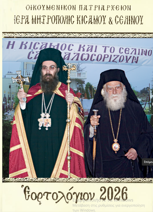 Το Εορτολόγιο – Ημερολόγιο του έτους 2026 της Ιεράς Μητροπόλεως Κισάμου και Σελίνου είναι αφιερωμένο «.. εις τα είκοσι έτη Αρχιερατείας του Σεβασμιωτάτου Μητροπολίτου Κισάμου και Σελίνου κ. Αμφιλοχίου».