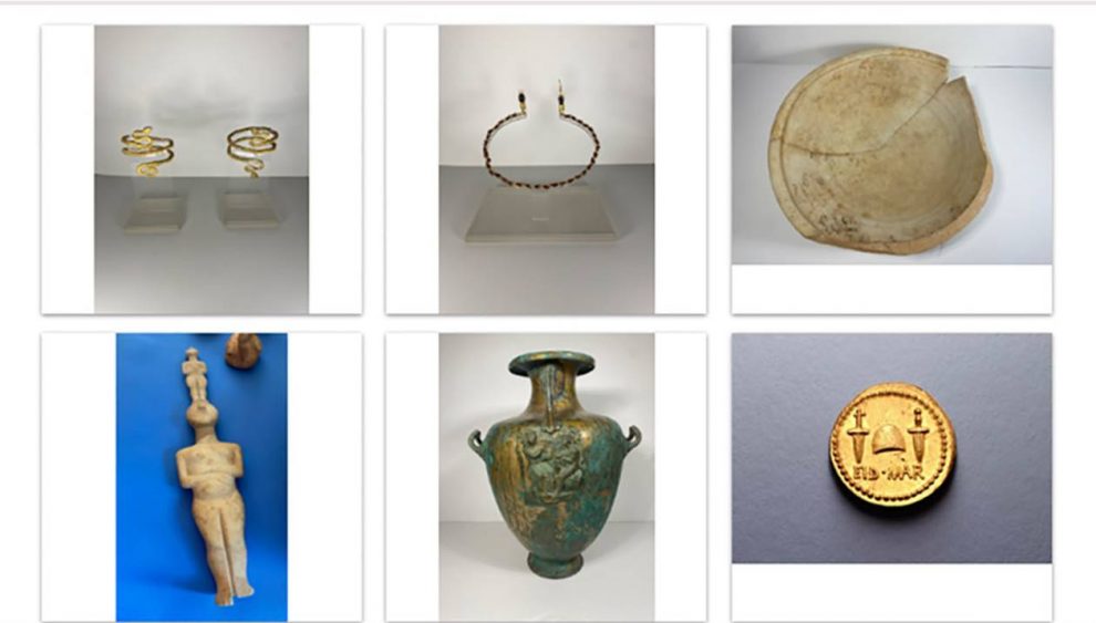 Μαρμάρινα και χάλκινα ειδώλια ανθρώπων και ζώων, μαρμάρινα, αργυρά, χάλκινα και πήλινα αγγεία, χρυσά και χάλκινα κοσμήματα, τμήμα τοιχογραφίας, που βρίσκονταν στην Συλλογή της Shelby White, καθώς και ένα σπανιότατο χρυσό νόμισμα, το οποίο παραπέμπει στις ειδούς του Μαρτίου, την ημέρα της δολοφονίας του Ιούλιου Καίσαρα, που κατασχέθηκε σε Οίκο Δημοπρασιών, συγκαταλέγονται ανάμεσά τους. Οι αρχαιότητες αυτές καλύπτουν ένα ευρύ χρονολογικό φάσμα από τους προϊστορικούς έως και τους ρωμαϊκούς χρόνους.
