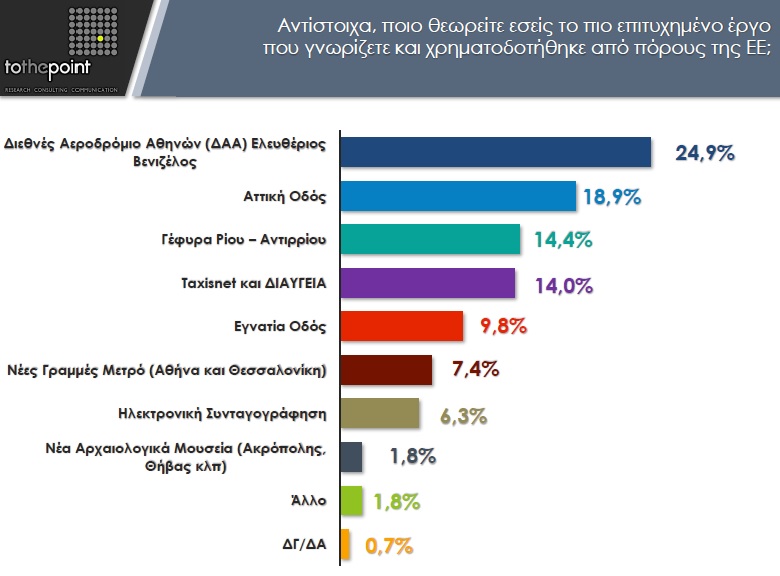 Στην ερώτηση για το πιο επιτυχημένο έργο που γνωρίζετε και χρηματοδοτήθηκε από πόρους της ΕΕ, οι Έλληνες επέλεξαν στην κορυφή τον Διεθνή Αερολιμένα Αθηνών “Ελευθέριος Βενιζέλος” με ποσοστό 24,9%. Ακολουθούν τα έργα της Αττικής Οδού, η Γέφυρα Ρίου- Αντιρρίου, Taxis Net και Διαύγεια, Εγνατία Οδός και Νέες Γραμμές του Μετρό σε Αθήνα και Θεσσαλονίκη με ποσοστά 18,9%, 14,4%, 14%, 9,8% και 7,4% αντίστοιχα. Τέλος, οι ερωτηθέντες επέλεξαν ως επόμενα στις προτιμήσεις τους πιο σύγχρονα, κάπως, έργα όπως η Ηλεκτρονική Συνταγογράφηση (6,3%) και τα νέα Αρχαιολογικά Μουσεία, όπως αυτά σε Ακρόπολη, Θήβα κλπ (1,8%).
