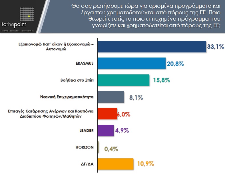 Στην ίδια ερώτηση, με προκαθορισμένες απαντήσεις, για τα πιο πετυχημένα ευρωπαϊκά προγράμματα, στις προτιμήσεις των πολιτών ακολουθούν τα προγράμματα Erasmus με 20,8%, δηλαδή σχεδόν 1 στους 5 πολίτες επιλέγουν ως επιτυχημένη τη σχετική κοινοτική πρωτοβουλία με τις (ακαδημαϊκές – φοιτητικές – επιχειρηματικές, κατά βάση) ανταλλαγές. Επόμενα στις προτιμήσεις των πολιτών έρχονται τα προγράμματα Βοήθεια στο Σπίτι (15,8%), το πρόγραμμα Νεανική Επιχειρηματικότητα (8,1%), οι Επιταγές Κατάρτισης Ανέργων και τα Κουπόνια Διαδικτύου Φοιτητών/Μαθητών (6%), που έχουν χρηματοδοτηθεί και κάποια συνεχίζουν από τομεακά και περιφερειακά προγράμματα του ΕΣΠΑ, με πόρους της Πολιτικής Συνοχής της ΕΕ. Άλλες κοινοτικές πρωτοβουλίες, όπως το πρόγραμμα Leader (4,9%), που αφορά την ύπαιθρο χώρα και το πρόγραμμα Horizon (με μόλις 0,4%), συγκεντρώνουν πολύ λιγότερες προτιμήσεις, πιθανότατα και αναγνωρισιμότητα, στο δείγμα της έρευνας, ενώ ένα ποσοστό 10,9% των ερωτηθέντων δεν θέλησε να κατονομάσει κάποιο από τα παραπάνω.