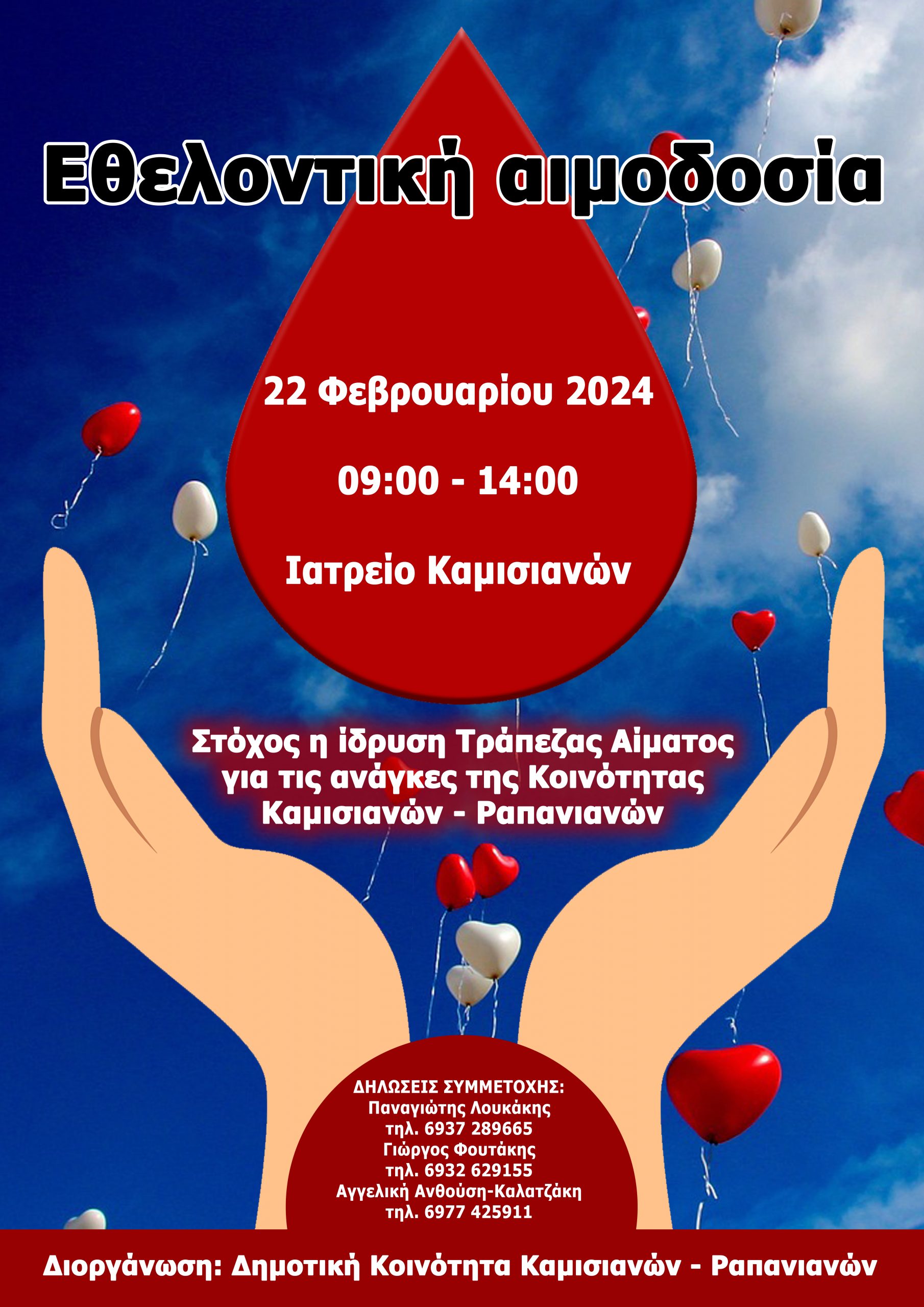 Η Δημοτική Κοινότητα Καμισιανών – Ραπανιανών διοργανώνει εθελοντική αιμοδοσία, την Πέμπτη 22 Φεβρουαρίου 2024, από τις 9 το πρωί έως τις 2 το μεσημέρι, στον χώρο του Ιατρείου Καμισιανών (πρώην Κοινοτικό Κατάστημα).