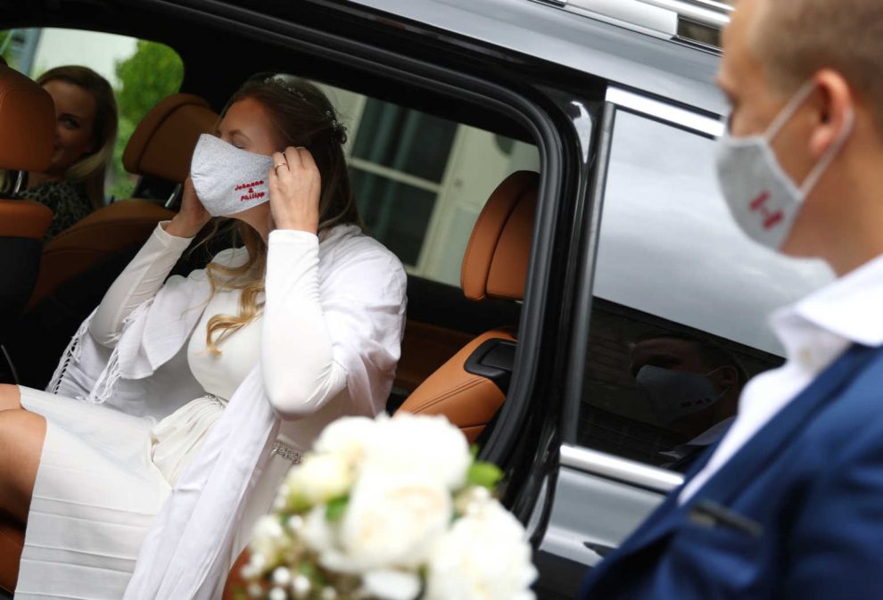 Johanna and Philipp Sofsky arrive for their wedding outside the temporary registry office in Hanau, Germany, May 2, 2020, as the spread of the coronavirus disease (COVID-19) continues. REUTERS/Kai Pfaffenbach